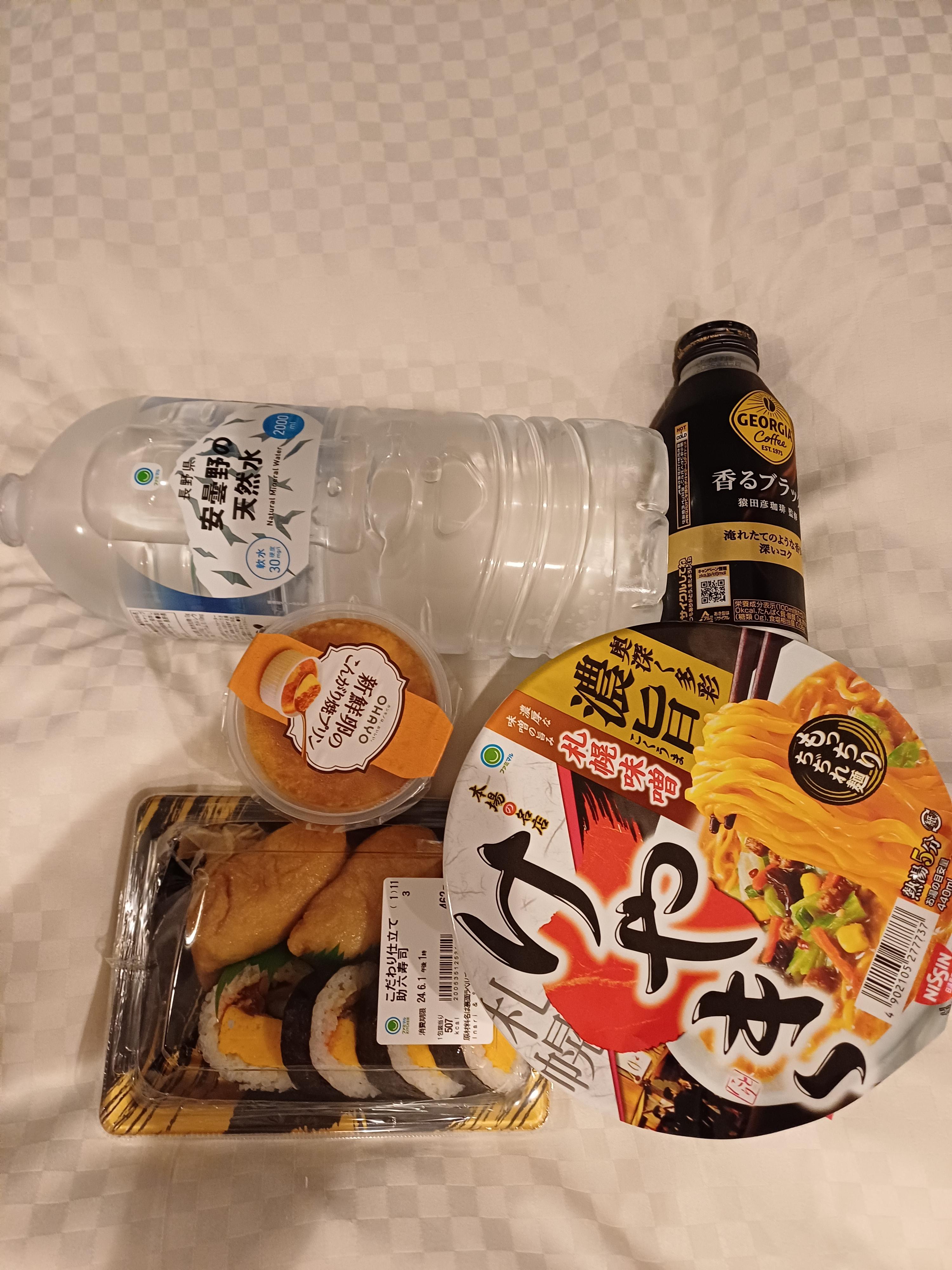 여유가 된다면 웨이팅을 하고 상점가를 구경해도 됐지만 다음날에 아침 일찍 하코네 당일치기를 했어야 했기 때문에 간단하게 편의점 음식으로 저녁을 해결하기로 했습니다. 컵라면과 김밥, 초밥세트와 디저트까지 사서 먹으며 하루를 마무리했습니다.